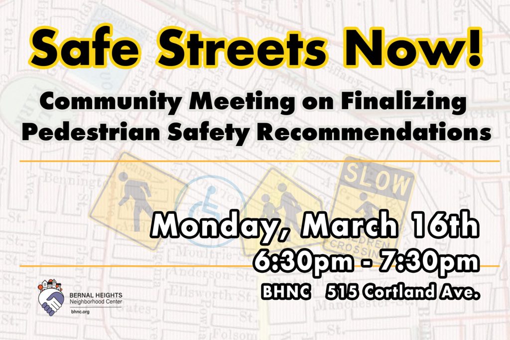 This meeting is the next step in our community-led process to implement safety improvements on Cortland. Together, we will discuss and refine a final list of immediate street safety improvements to formally submit to our District Supervisor and SFMTA.